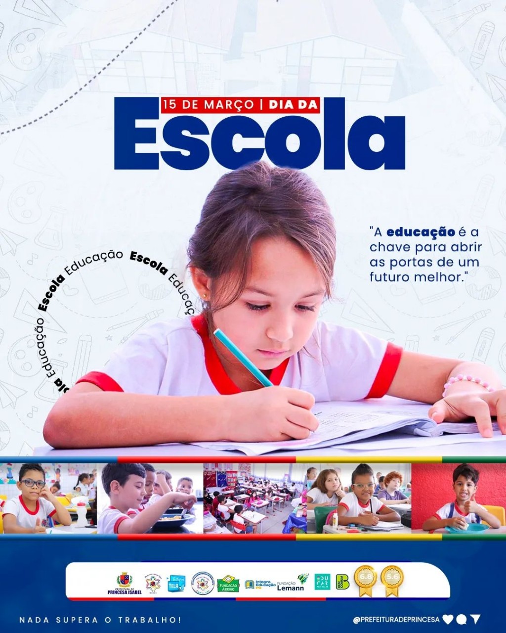 Lugar de desenvolvimento social e intelectual do aluno a escola tem um papel fundamental na sociedade. Celebramos neste 15 de março o Dia da Escola. Em Princesa Isabel temos novas escolas, construções em andamento, reformas com climatização, melhor IDEB entre os 223 municípios da Paraíba nos anos iniciais e o quarto lugar entre os anos finais.