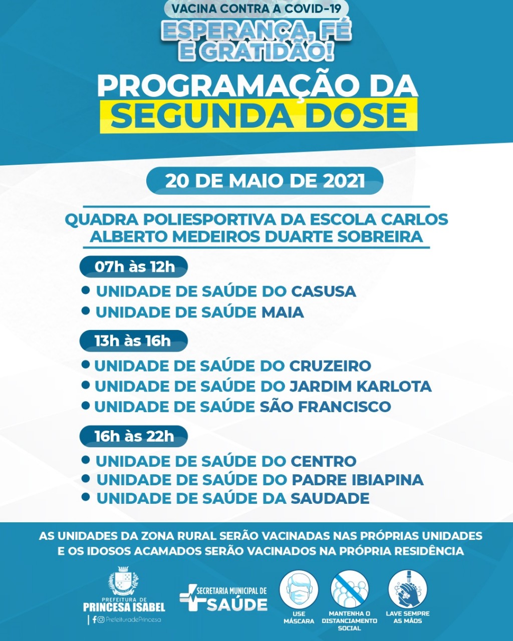 A segunda dose da vacina Coronavac será aplicada nesta quinta-feira, 20 de maio de 2021. A vacinação será na Quadra Poliesportiva da Escola Carlos Alberto. Então veja qual é a sua UBS é vá até a Quadra no horário descrito. Não esqueça de levar os documentos pessoais e Cartão de Vacina.