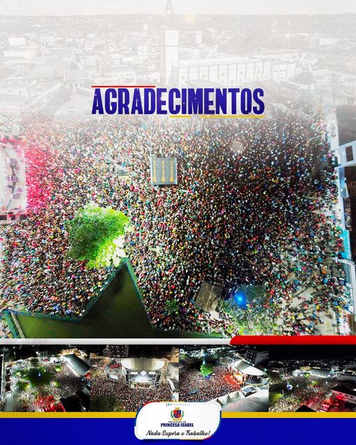A Prefeitura de Princesa Isabel vem a público agradecer aos colaboradores a importante parceria para realização de mais um grandioso evento, desta feita, alusivo às comemorações dos 147 de Emancipação Política do Município de Princesa Isabel. Em especial, agradecemos a 5ª Companhia de Polícia Militar da Paraíba, Polícia Civil, 5ª Companhia de Bombeiros Militares da Paraíba, equipes de segurança, bombeiros civis, SAMU, Diretoria de Cultura, Turismo e Eventos, Secretaria de Infraestrutura, Comunicação Institucional do Governo de Princesa Isabel, demais secretarias do município, Imprensa, comerciantes e, enfim, a todos que diretamente ou indiretamente contribuíram para a realização desta brilhante festa. O resultado do empenho de todos resultou em mais um evento com quebra de recordes de público onde acontecem os maiores e melhores eventos com características intrínsecas à nossa cidade, a nossa região: harmonia, tranquilidade e entretenimento.