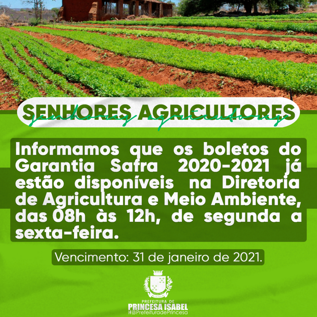 Senhores agricultores. Informamos que os boletos do Garantia Safra 2020-2021 já estão disponíveis na Diretoria de Agricultura e Meio Ambiente, das 08h às 12h, de segunda a sexta-feira. Vencimento 31 de Janeiro de 2021.