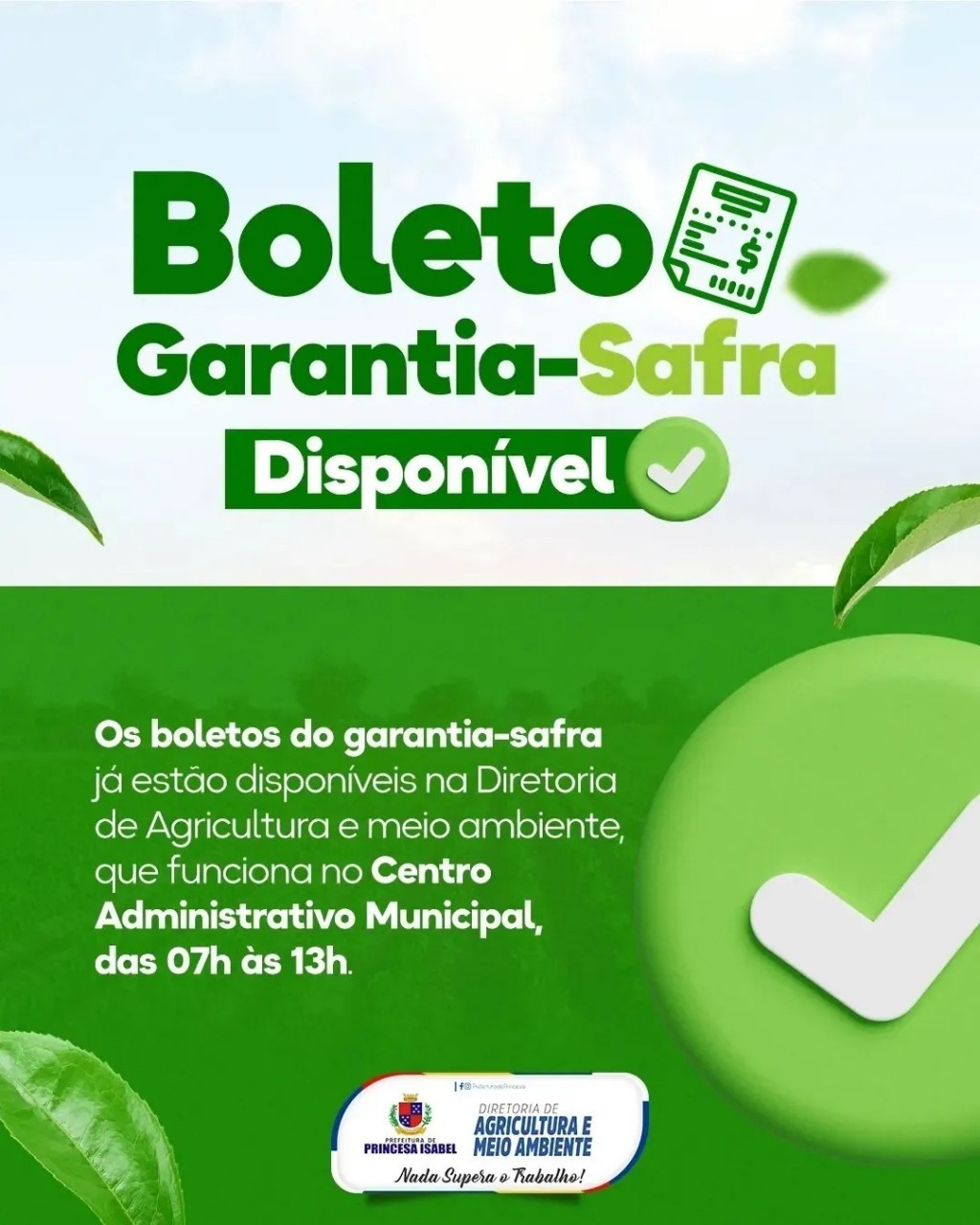 Os boletos do Garantia Safra já estão disponíveis na Diretoria de Meio Ambiente e Agricultura.