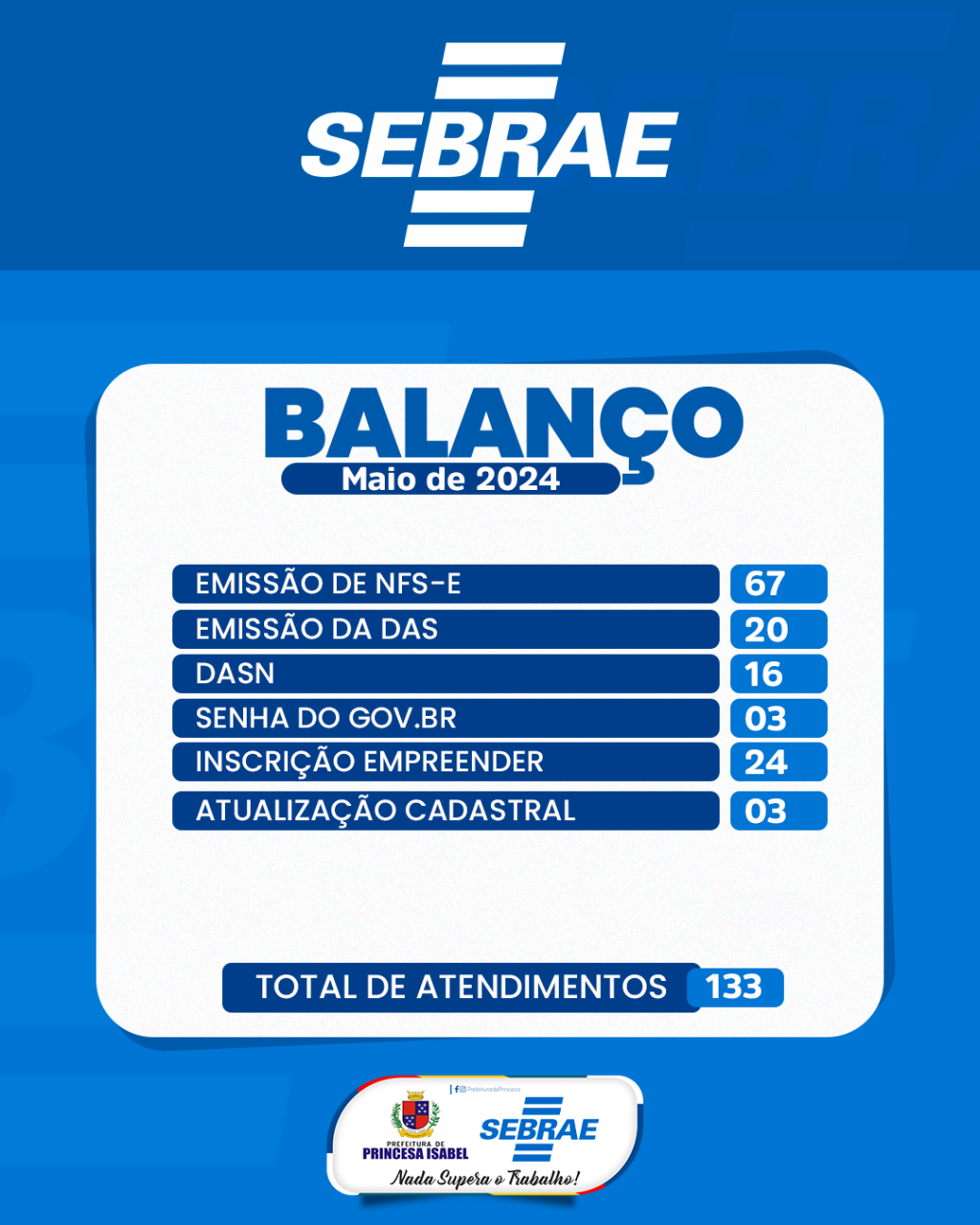 Balanço do posto de atendimento do SEBRAE em maio de 2024.