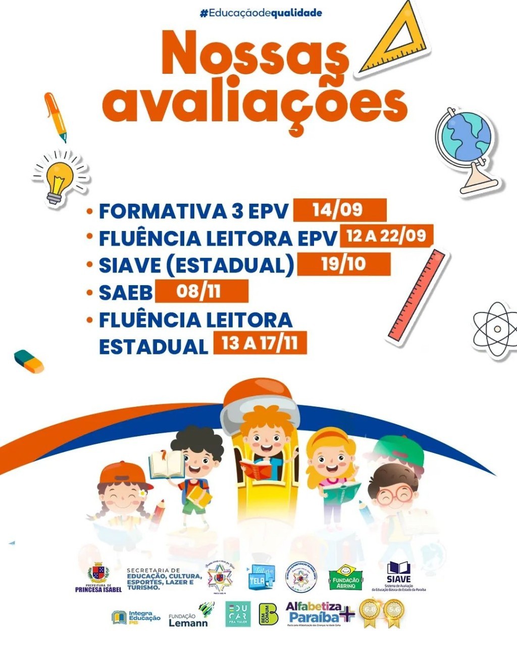 As nossas avaliações externas iniciaram. Fiquem atentos às datas e deixem os seus filhos fazerem parte dessa história de sucesso.