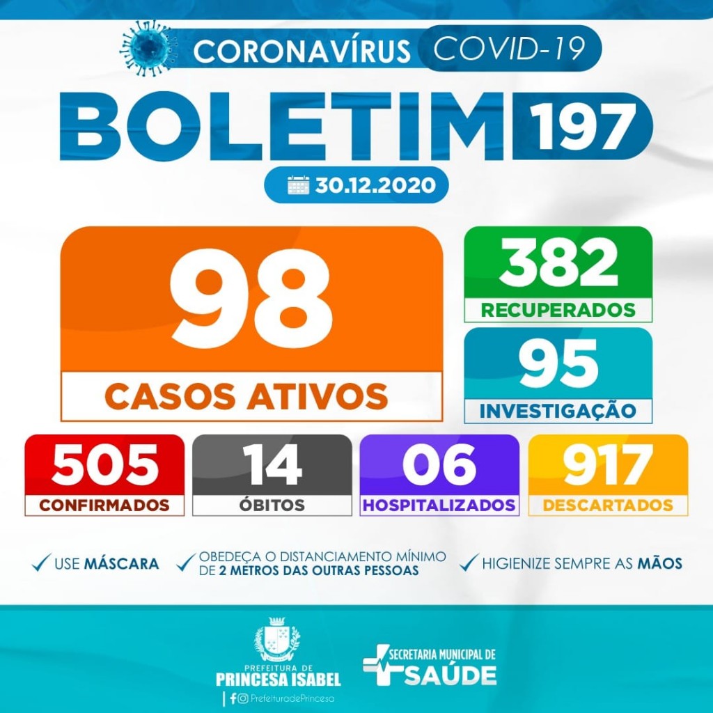 6. O uso de máscaras é obrigatório em todo o município de Princesa Isabel, conforme decreto editado e publicado na íntegra na página oficial do governo municipal e redes sociais da prefeitura.