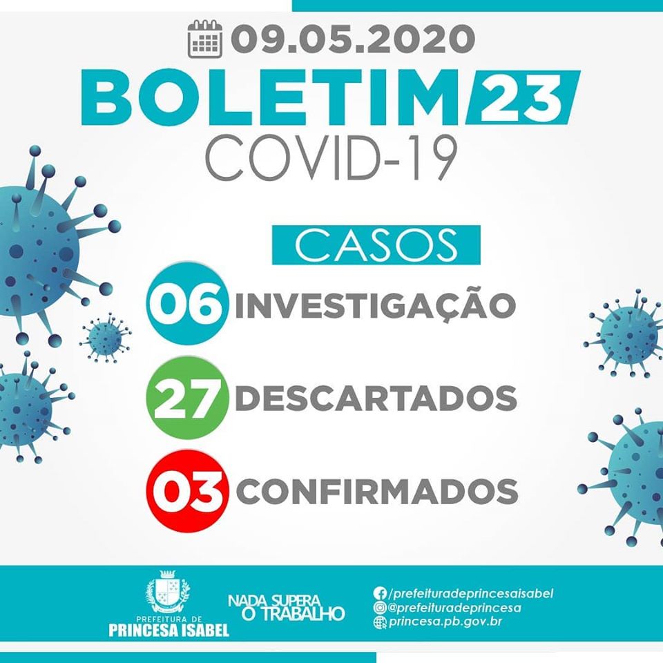 O Comitê Gestor da Crise COVID-19, em Princesa Isabel informa: 1. Até o momento, foram atendidos no Hospital Regional Deputado José Pereira Lima, UPA 24h e na Rede de Atenção Básica, trinta e seis casos suspeitos de infecção por COVID-19 (Coronavírus); desses, 27 foram descartados, 03 confirmados e 06 estão em investigação. Já foram notificadas e assinaram o Termo de Compromisso da Quarentena nas Barreiras Sanitárias 469 pessoas vindas de outras regiões do país, das quais 320 já cumpriram o isolamento e 149 seguem no período de cumprimento. 2. Reiteramos que todas as medidas utilizadas para atestar como casos suspeitos e casos descartados, seguem rigorosamente o que preconiza o Ministério da Saúde; 3. As determinações do Ministério da Saúde para achatar a curva epidemiológica da disseminação da CODIV-19 continuam massificadas; 4. Segundo a Organização Mundial da Saúde e o Ministério da Saúde, o isolamento social é a mais importante medida de contenção da disseminação do Coronavírus; só saia de casa em situação de extrema necessidade. 5. As determinações contidas no Decreto Municipal 07 de 21 de março de 2020 DEVEM ser cumpridas; sua desobediência está sujeita ao uso da força policial e medidas judiciais. 6. O uso de máscaras é obrigatório em todo o município de Princesa Isabel, conforme decreto editado e publicado na íntegra na página oficial do governo municipal e redes sociais da prefeitura.