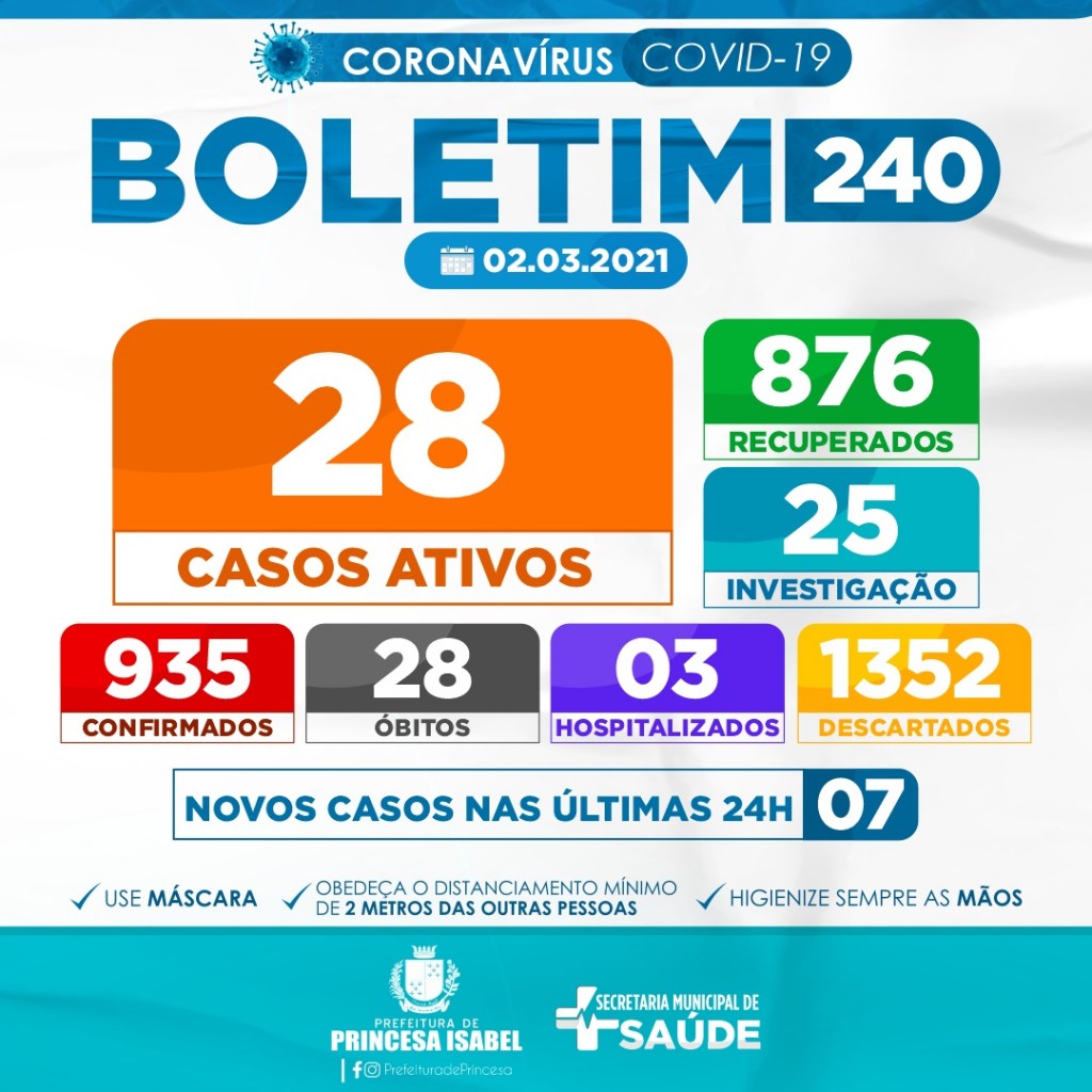 6. O uso de máscaras é obrigatório em todo o município de Princesa Isabel, conforme decreto editado e publicado na íntegra na página oficial do governo municipal e redes sociais da prefeitura.