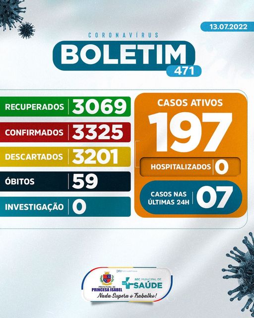 O Comitê Gestor da Crise COVID-19, em Princesa Isabel, informa: 1. Até o momento foram atendidos no Hospital Regional Deputado José Pereira Lima, UPA 24h e na Rede de Atenção Básica 6.526 pessoas suspeitas de infecção por COVID-19 (Coronavírus); desses, 3.201 foram descartados, 3.325 confirmados e nenhum caso está em investigação. Dos confirmados, nenhum está hospitalizado, 3.069 foram recuperados e 59 foram a óbito. 2. Todas as medidas utilizadas para atestar como casos suspeitos e casos descartados, seguem rigorosamente o que preconiza o Ministério da Saúde; 3. As determinações do Ministério da Saúde para achatar a curva epidemiológica da disseminação da COVID-19 e de suas variantes continuam massificadas; 4. As determinações contidas nos decretos municipais DEVEM ser cumpridas. Princesa Isabel, 13 de julho de 2022.
