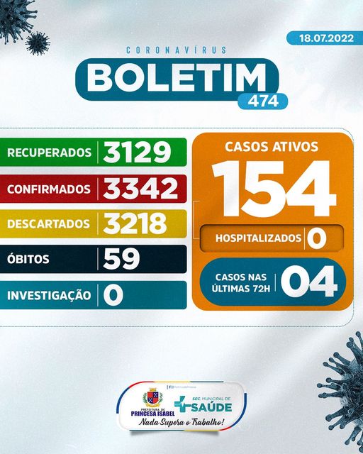 O Comitê Gestor da Crise COVID-19, em Princesa Isabel, informa: 1. Até o momento foram atendidos no Hospital Regional Deputado José Pereira Lima, UPA 24h e na Rede de Atenção Básica 6.560 pessoas suspeitas de infecção por COVID-19 (Coronavírus); desses, 3.218 foram descartados, 3.342 confirmados e nenhum caso está em investigação. Dos confirmados, nenhum está hospitalizado, 3.129 foram recuperados e 59 foram a óbito. 2. Todas as medidas utilizadas para atestar como casos suspeitos e casos descartados, seguem rigorosamente o que preconiza o Ministério da Saúde; 3. As determinações do Ministério da Saúde para achatar a curva epidemiológica da disseminação da COVID-19 e de suas variantes continuam massificadas; 4. As determinações contidas nos decretos municipais DEVEM ser cumpridas. Princesa Isabel, 18 de julho de 2022.