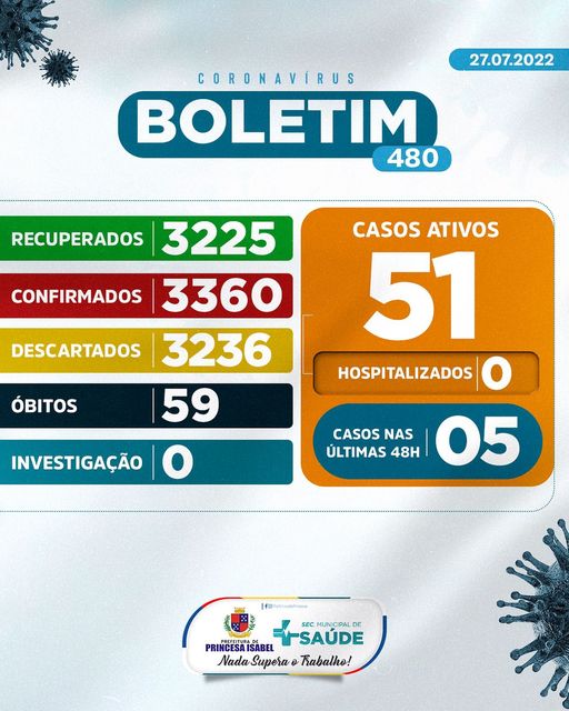 O Comitê Gestor da Crise COVID-19, em Princesa Isabel, informa: 1. Até o momento foram atendidos no Hospital Regional Deputado José Pereira Lima, UPA 24h e na Rede de Atenção Básica 6.596 pessoas suspeitas de infecção por COVID-19 (Coronavírus); desses, 3.225 foram descartados, 3.360 confirmados e nenhum caso está em investigação. Dos confirmados, nenhum está hospitalizado, 3.225 foram recuperados e 59 foram a óbito. 2. Todas as medidas utilizadas para atestar como casos suspeitos e casos descartados, seguem rigorosamente o que preconiza o Ministério da Saúde; 3. As determinações do Ministério da Saúde para achatar a curva epidemiológica da disseminação da COVID-19 e de suas variantes continuam massificadas; 4. As determinações contidas nos decretos municipais DEVEM ser cumpridas. Princesa Isabel, 27 de julho de 2022.