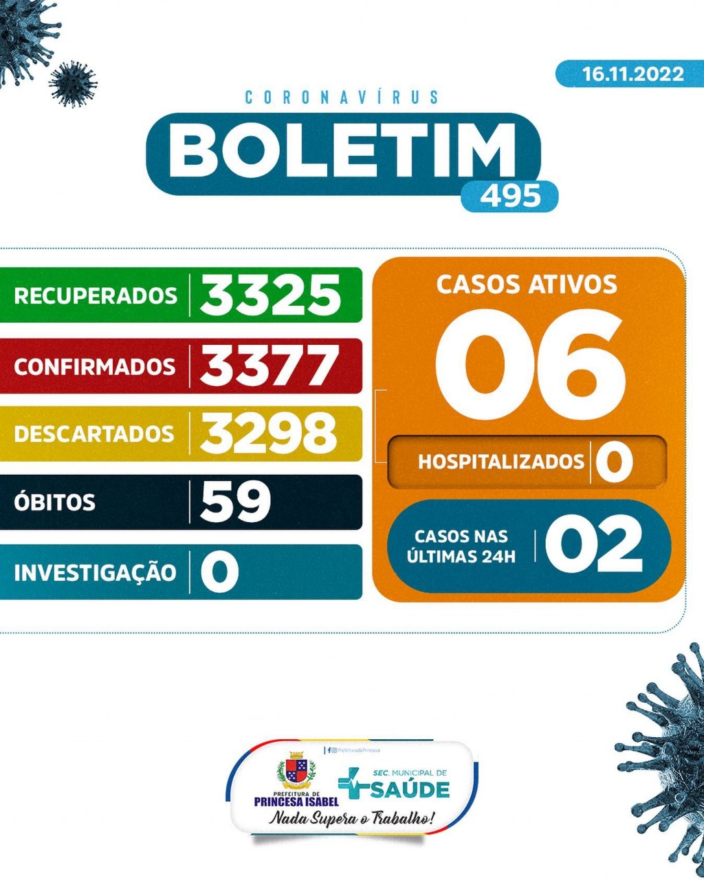 O Comitê Gestor da Crise COVID-19, em Princesa Isabel, informa: 1. Até o momento foram atendidos no Hospital Regional Deputado José Pereira Lima, UPA 24h e na Rede de Atenção Básica 6.675 pessoas suspeitas de infecção por COVID-19 (Coronavírus); desses, 3.298 foram descartados, 3.377 confirmados e nenhum caso está em investigação. Dos confirmados, nenhum está hospitalizado, 3.325 foram recuperados e 59 foram a óbito. 2. Todas as medidas utilizadas para atestar como casos suspeitos e casos descartados, seguem rigorosamente o que preconiza o Ministério da Saúde; 3. As determinações do Ministério da Saúde para achatar a curva epidemiológica da disseminação da COVID-19 e de suas variantes continuam massificadas; 4. As determinações contidas nos decretos municipais DEVEM ser cumpridas. Princesa Isabel, 16 de novembro de 2022.