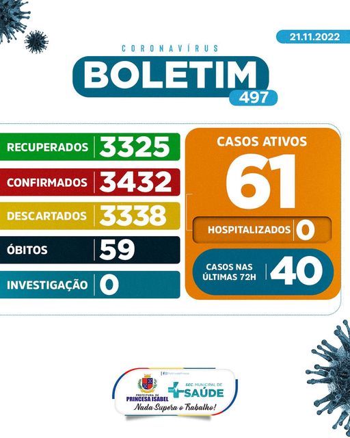 O Comitê Gestor da Crise COVID-19, em Princesa Isabel, informa: 1. Até o momento foram atendidos no Hospital Regional Deputado José Pereira Lima, UPA 24h e na Rede de Atenção Básica 6.770 pessoas suspeitas de infecção por COVID-19 (Coronavírus); desses, 3.338 foram descartados, 3.432 confirmados e nenhum caso está em investigação. Dos confirmados, nenhum está hospitalizado, 3.325 foram recuperados e 59 foram a óbito. 2. Todas as medidas utilizadas para atestar como casos suspeitos e casos descartados, seguem rigorosamente o que preconiza o Ministério da Saúde; 3. As determinações do Ministério da Saúde para achatar a curva epidemiológica da disseminação da COVID-19 e de suas variantes continuam massificadas; 4. As determinações contidas nos decretos municipais DEVEM ser cumpridas. Princesa Isabel, 21 de novembro de 2022.