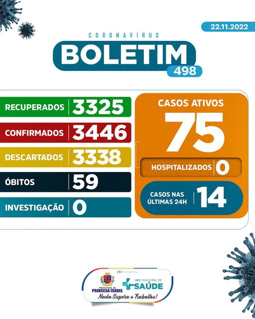 O Comitê Gestor da Crise COVID-19, em Princesa Isabel, informa: 1. Até o momento foram atendidos no Hospital Regional Deputado José Pereira Lima, UPA 24h e na Rede de Atenção Básica 6.784 pessoas suspeitas de infecção por COVID-19 (Coronavírus); desses, 3.338 foram descartados, 3.446 confirmados e nenhum caso está em investigação. Dos confirmados, nenhum está hospitalizado, 3.325 foram recuperados e 59 foram a óbito. 2. Todas as medidas utilizadas para atestar como casos suspeitos e casos descartados, seguem rigorosamente o que preconiza o Ministério da Saúde; 3. As determinações do Ministério da Saúde para achatar a curva epidemiológica da disseminação da COVID-19 e de suas variantes continuam massificadas; 4. As determinações contidas nos decretos municipais DEVEM ser cumpridas. Princesa Isabel, 22 de novembro de 2022.