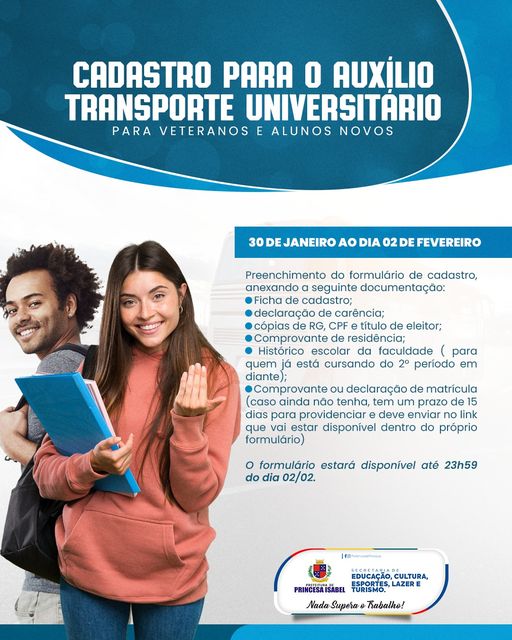 O cadastro para o auxílio transporte, para veteranos e novatos, começa hoje e vai até quinta-feira. Inscreva-se, pelo link: Aqui