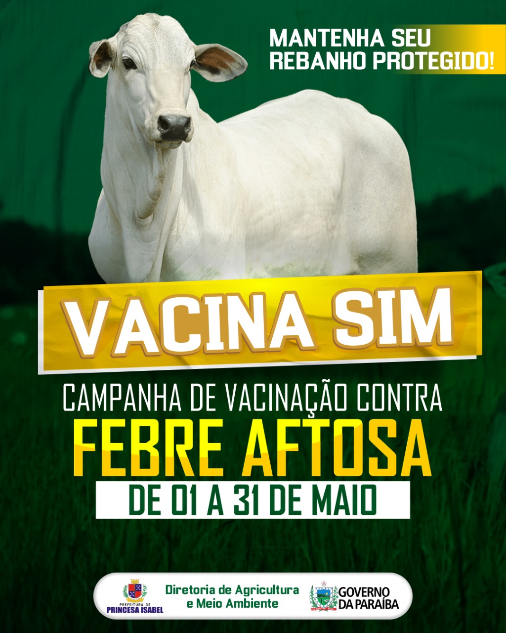 A Campanha Estadual Contra Febre Aftosa iniciou oficialmente dia 01 de maio e deve seguir até o dia 31. O rebanho no município é de aproximadamente 12 mil cabeças. A vacinação é obrigatória e para todas as idades dos animais. A vacinação será acompanhada pela Diretoria Municipal de Agricultura e pela ULSAV - Unidade Local de Sanidade Animal e Vegetal. No caso de dúvidas, os produtores devem se dirigir à Diretoria de Agricultura, localizada a Rua Presidente João Pessoa, em frente a Escola Estadual Gama e Melo.