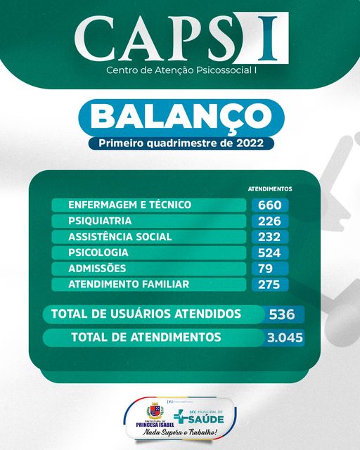 O Centro de Atenção Psicossocial tipo 1 (CAPS I) de Princesa realizou, somente nos quatro primeiros meses do ano de 2022, o total de 3.049 atendimentos. Desses, foram 660 em enfermagem e/ou técnico, 226 em psiquiatria, 232 em assistência social e 524 em Psicologia, além de 1.128 atendimentos individualizados e 275 familiares. Esses atendimentos foram realizados com 536 usuários, dos quais 79 iniciaram o acompanhamento no serviço durante esse período.
