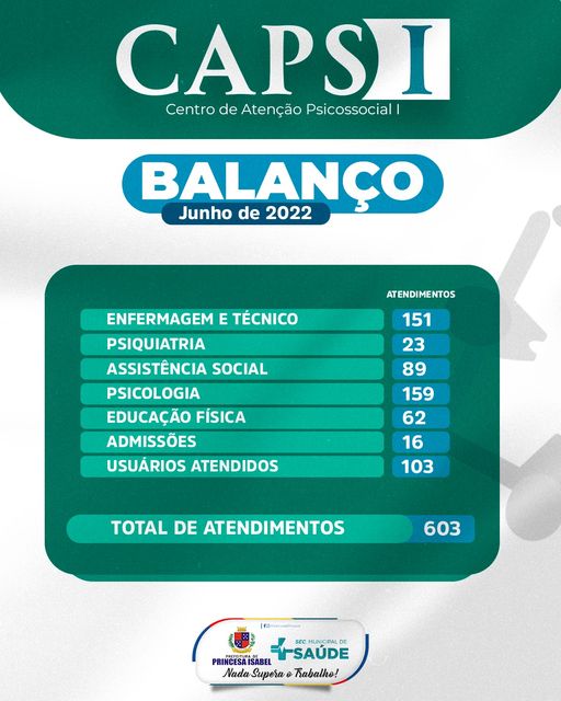 O Centro de Atenção Psicossocial tipo 1 (CAPS I) de Princesa realizou, somente no mês de junho, o total de 603 atendimentos. Desses, foram 151 em enfermagem e/ou técnico, 23 em psiquiatria, 89 em assistência social, 159 em Psicologia e 62 de Educação Física. Os atendimentos foram realizados com 103 usuários, dos quais 16 iniciaram o acompanhamento no serviço durante esse mês.