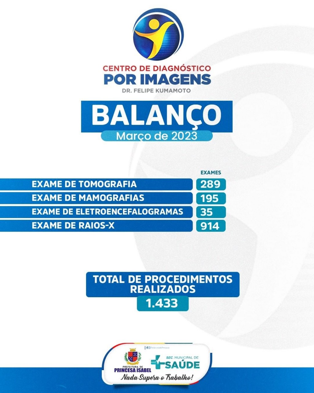 O Centro de Diagnóstico por Imagem Dr. Felipe Kumamoto realizou, durante o mês de março de 2023, 1.433 procedimentos. Desses, foram 289 tomografias, 195 mamografias, 35 eletroencefalogramas e 914 exames de Raio-X.