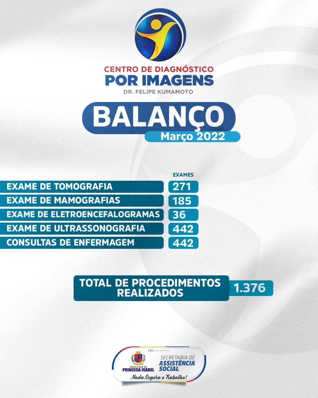 O Centro de Diagnóstico por Imagem Dr. Felipe Kumamoto realizou, durante o mês de março de 2022, 1.376 procedimentos. Desses, foram 271 tomografias, 185 mamografias, 36 eletroencefalogramas, 422 ultrassonografias e 442 consultas de enfermagem.