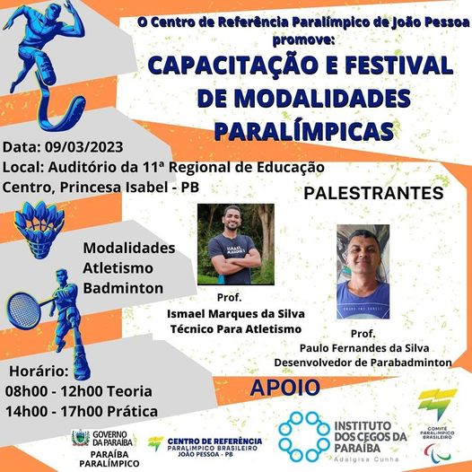 No dia 9 de março de 2023, Princesa Isabel receberá profissionais do Centro de Referência Paralímpico de João Pessoa para a realização da Capacitação e Festival de Modalidades Paralímpicas. As vagas são destinadas para profissionais da área, além de Educação Física, Pedagogos, diretores / secretários de esportes e AEE.