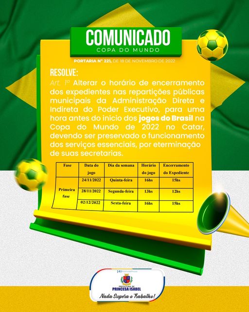 Nos dias de jogos da seleção Brasileira na Copa do Mundo os horários de expediente nas repartições públicas municipais da administração direta e indireta do Poder Executivo serão alterados. Confira!