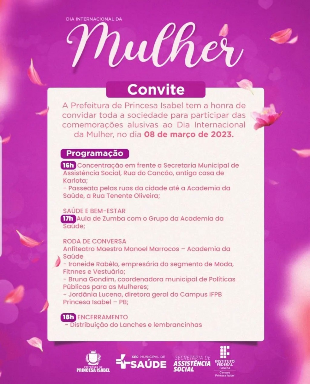 A prefeitura de Princesa Isabel tem a honra de convidar toda a sociedade para participar das comemorações alusivas ao Dia Internacional da Mulher, na quarta-feira, 8 de março de 2023.
