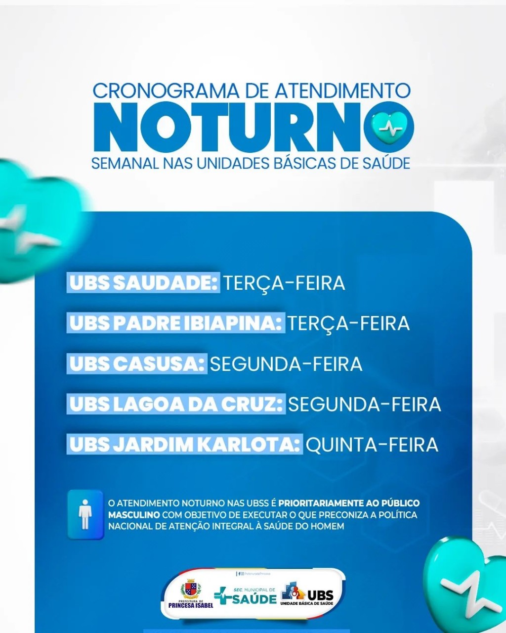 Confira o cronograma de atendimento noturno das UBSs, que é uma estratégia utilizada para atender prioritariamente a Saúde do Homem e do Trabalhador que não tem condições de buscar atendimento durante o dia, em razão de suas atividades diurnas.