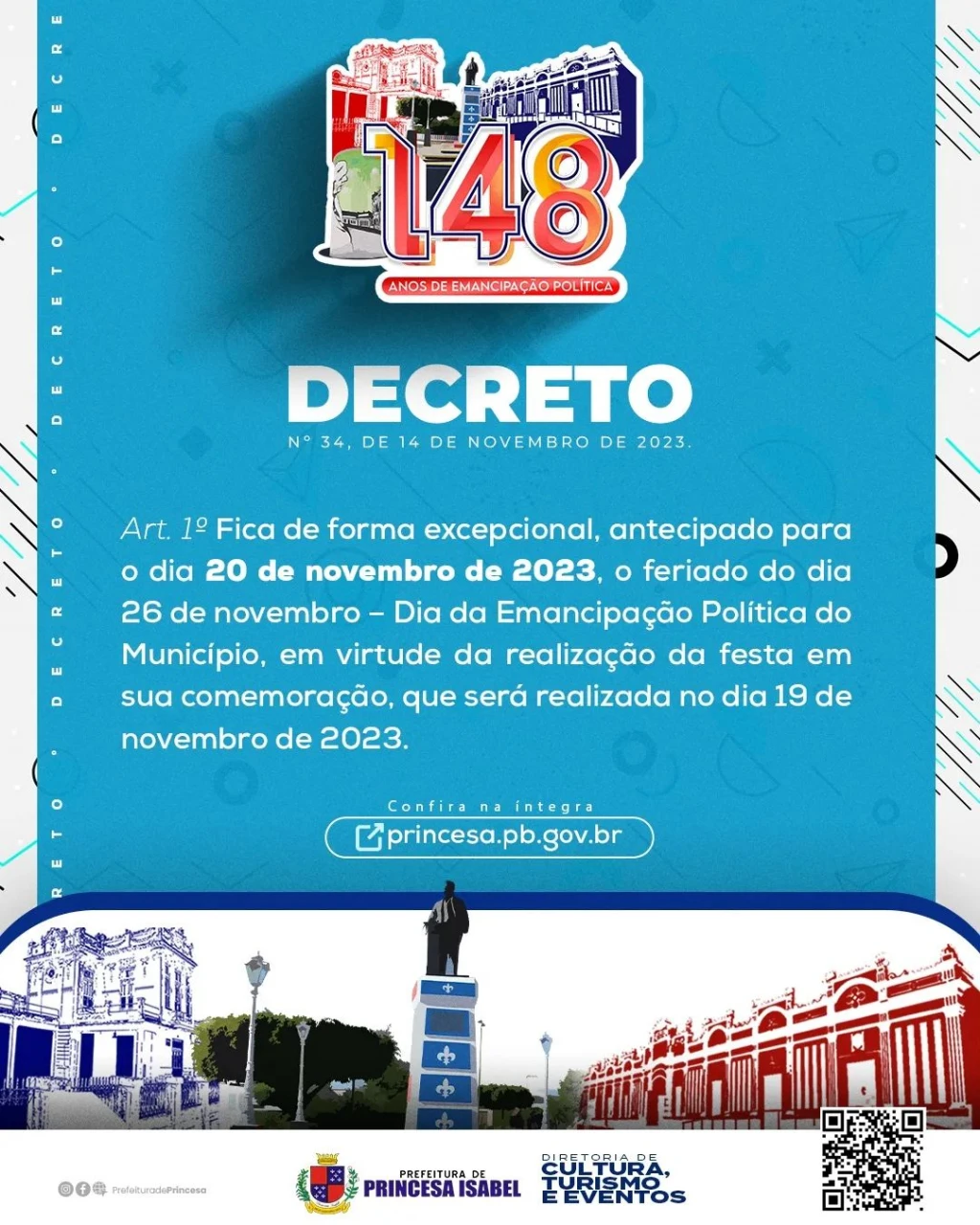 O governo de Princesa Isabel antecipa o feriado do dia 26 de novembro, alusivo à Emancipação Política do município, para a próxima segunda-feira (20), em razão das festividades comemorativas aos 148 anos da cidade.