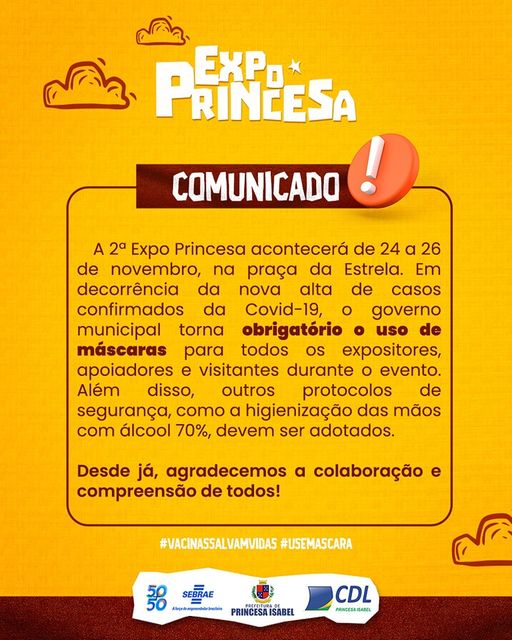 Novo Decreto torna obrigatório o uso de máscaras na Expo Princesa, que acontece de 24 a 26 de novembro, na Praça da Estrela.