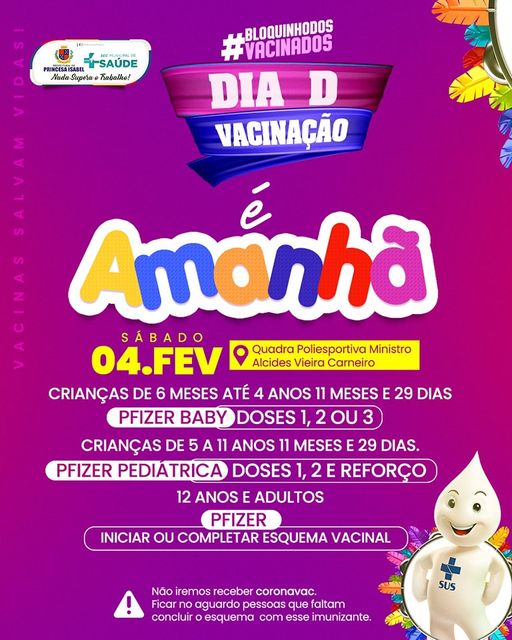 Amanhã será o grande dia de vacinação contra a COVID-19, para todas as idades. Compareça com a sua família na quadra Poliesportiva Ministro Alcides Vieira Carneiro, no horário das 08h às 12h deste sábado (04), e proteja você e quem você ama.