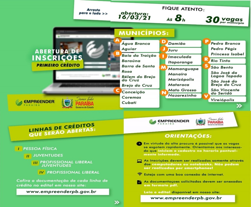 O Governo da Paraíba, através do Programa Empreender Paraíba, abre nesta terça-feira, 16 de março, linhas de créditos para pessoa física, juventudes, profissional liberal juventudes e profissional liberal. A inscrição para o crédito será a partir das 8:00 horas e serão 30 vagas disponibilizadas para cada um dos 31 municípios contemplados, entre eles, Princesa Isabel. Para maiores informações acesse: