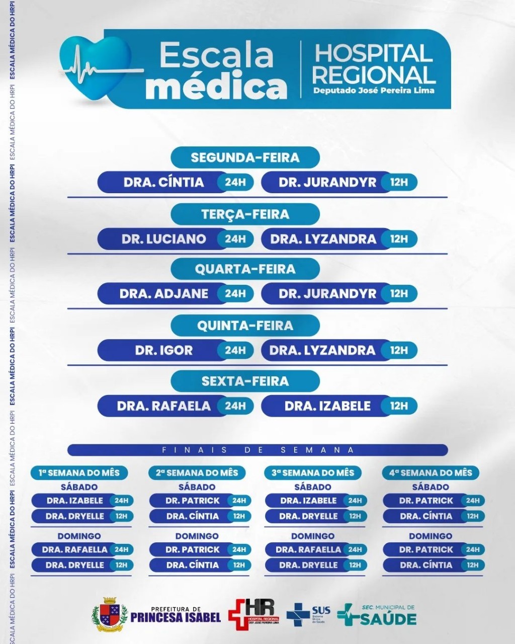 Confira a escala de médicos do Hospital Regional Deputado José Pereira Lima.
