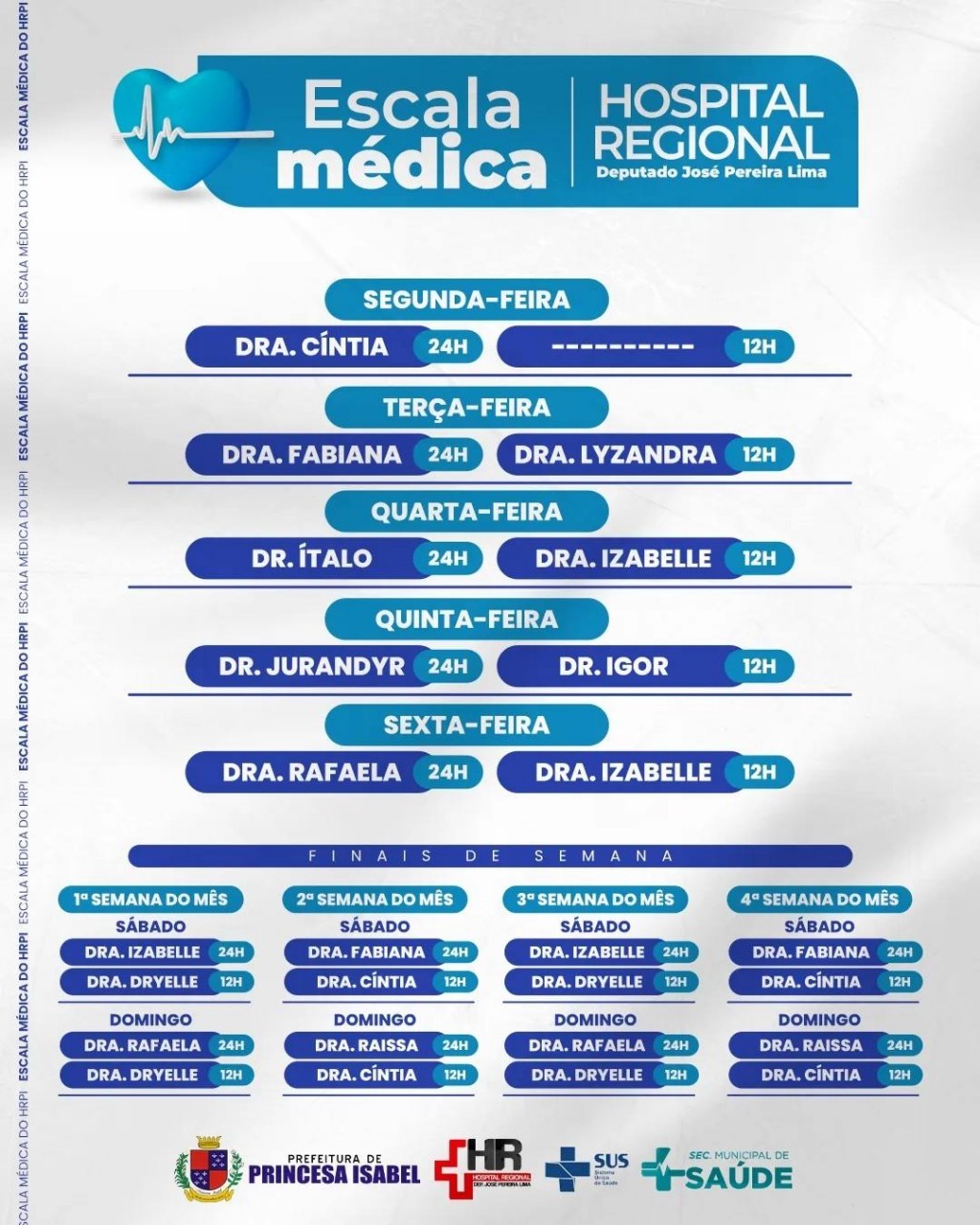 Confira a escala de médicos do Hospital Regional Deputado José Pereira Lima.
