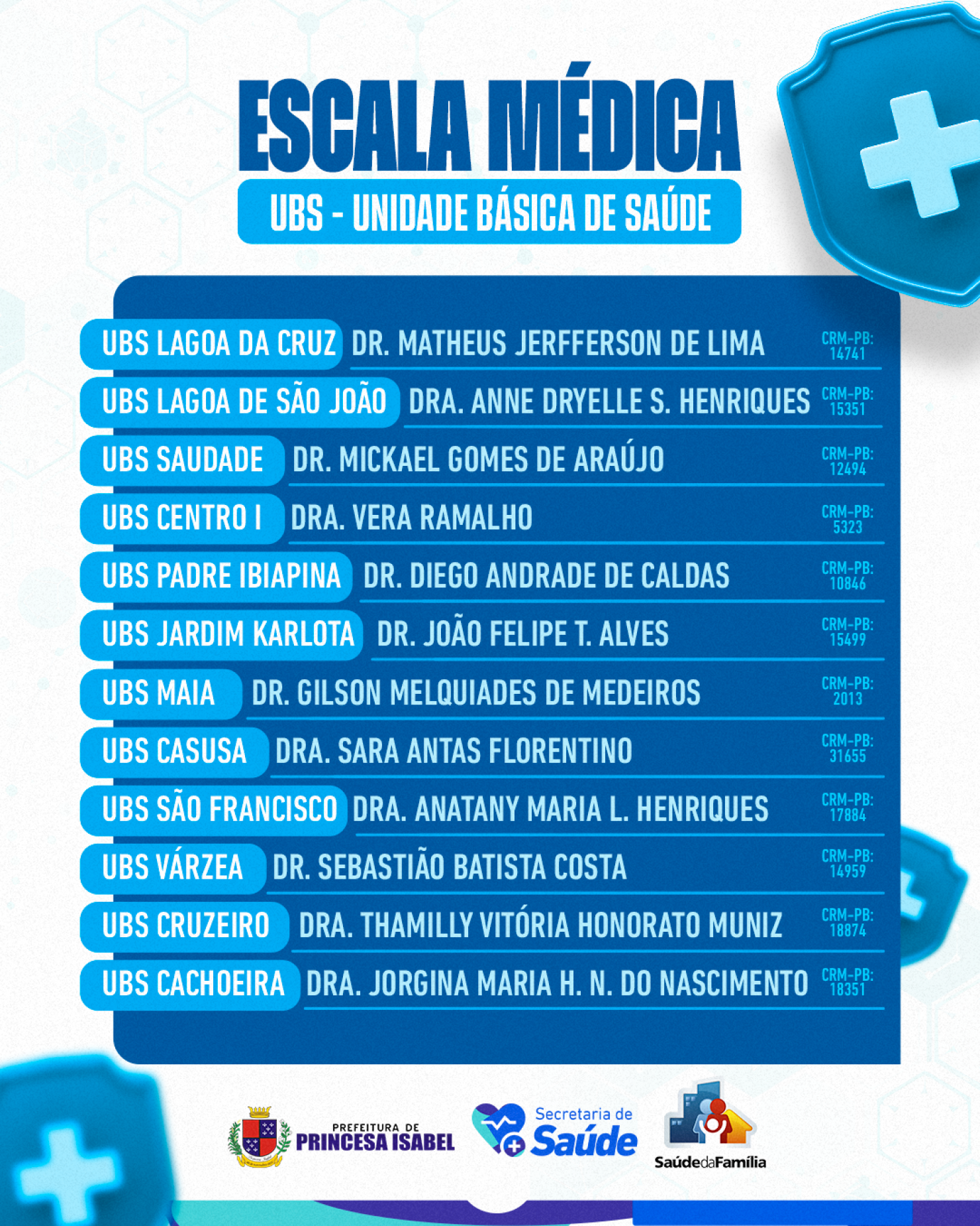 Confira a escala Médica das 12 Unidades Básicas de Saúde de Princesa.