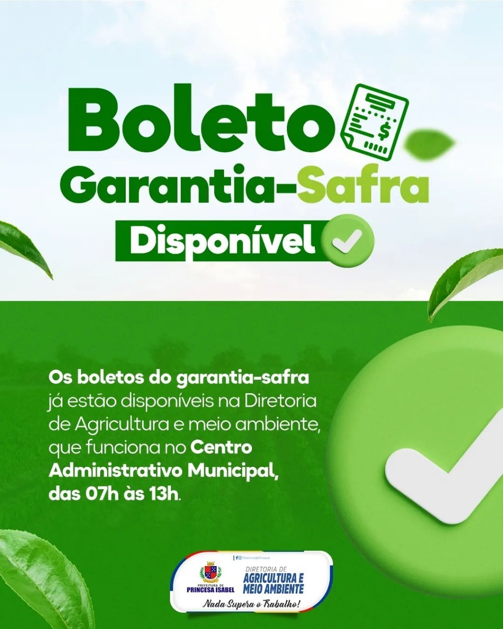 Os boletos do Garantia Safra já estão disponíveis na Diretoria de Meio Ambiente e Agricultura. O Governo de Princesa Isabel vem garantindo a contrapartida desde 2017. Um investimento anual de cerca de R$ 50 mil.