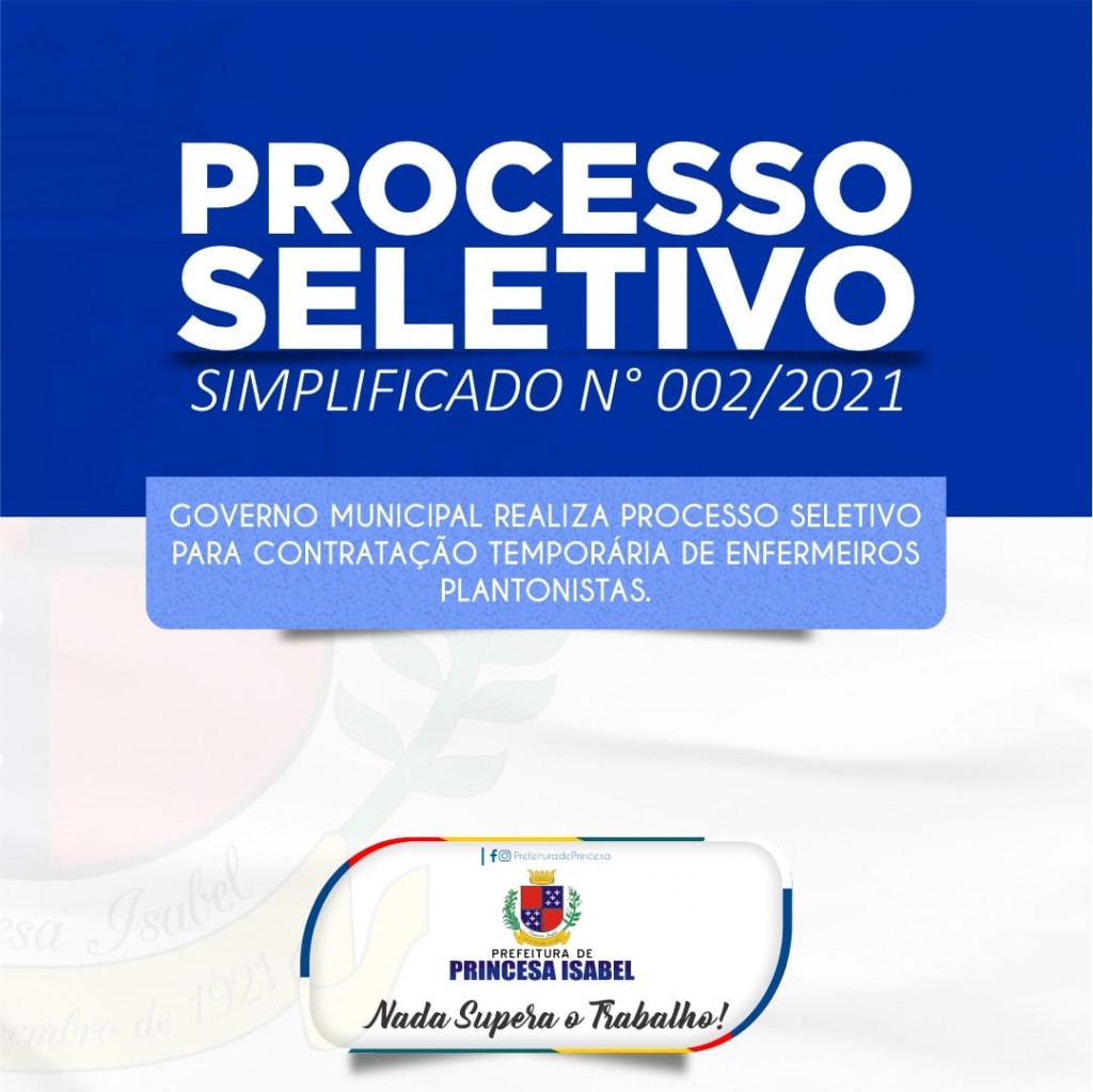 O Governo Municipal de Princesa Isabel abriu Processo Seletivo Simplificado para contratação temporária de 04 enfermeiros plantonistas para atendimento de excepcional interesse público da Secretaria Municipal de Saúde. As inscrições deverão ser realizadas exclusivamente por email, nesta quarta-feira (11).