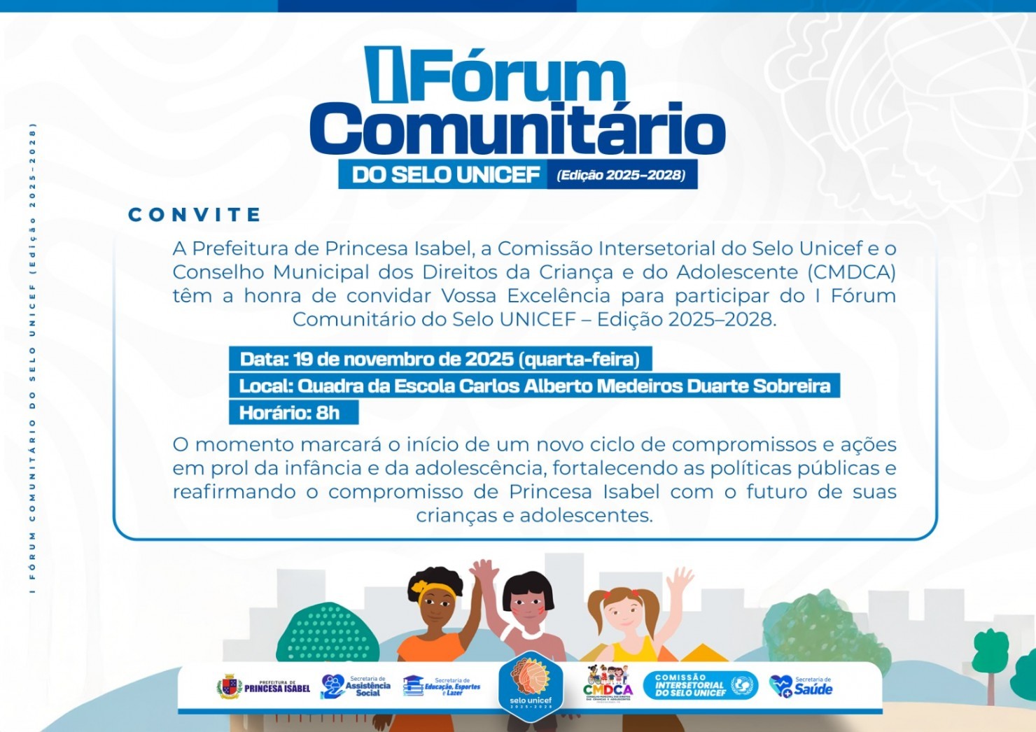 A Prefeitura de Princesa, por meio da Comissão Intersetorial do Selo Unicef e do CMDCA, realiza na próxima quarta-feira, 19 de novembro, o I Fórum Comunitário do Selo Unicef – Edição 2025–2028.