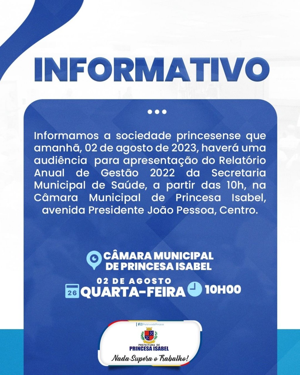 Informamos a sociedade princesense que amanhã, 02 de agosto de 2023, haverá uma audiência para apresentação do Relatório Anual de Gestão 2022 da Secretaria Municipal de Saúde, a partir das 10h, na Câmara Municipal de Princesa Isabel, avenida Presidente João Pessoa, Centro.