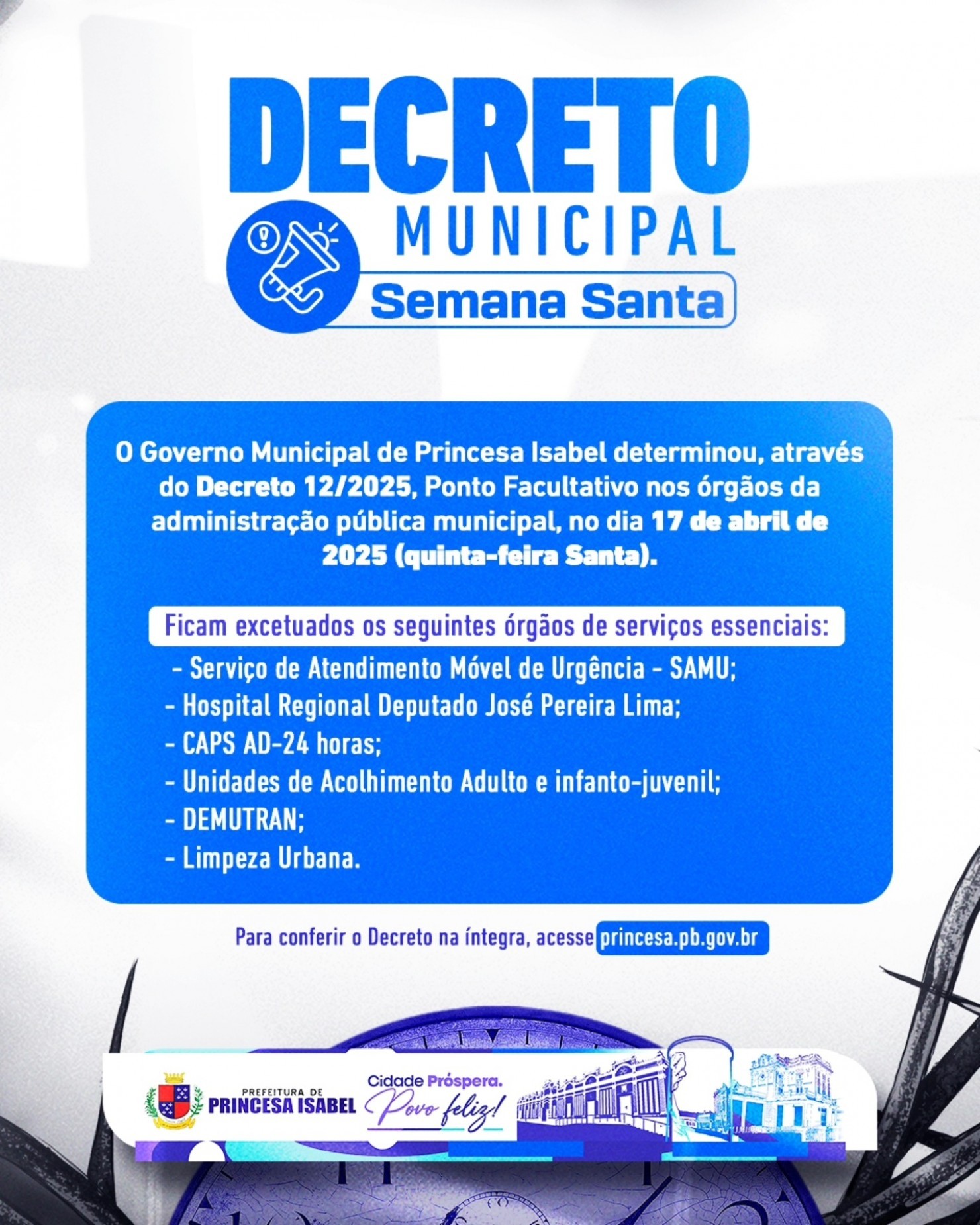 O Governo Municipal de Princesa decreta ponto facultativo nos órgãos da administração pública no próximo dia 17 de abril, quinta-feira Santa.