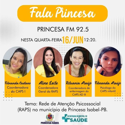 No "Fala, Princesa!" de hoje o nosso papo será sobre a Rede de Atenção Psicossocial do nosso município, com as coordenadoras Aline Leite, Fernanda Caetano, Fernanda Araújo e Rituânia Araújo.