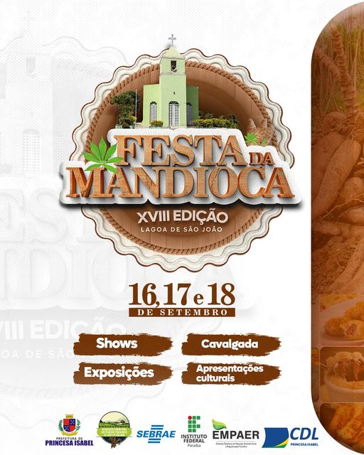Nos dias 16,17 e 18 de setembro acontecerá a XVIII Festa da Mandioca, no povoado de Lagoa de São João. Em breve a Prefeitura de Princesa Isabel divulgará toda a programação.