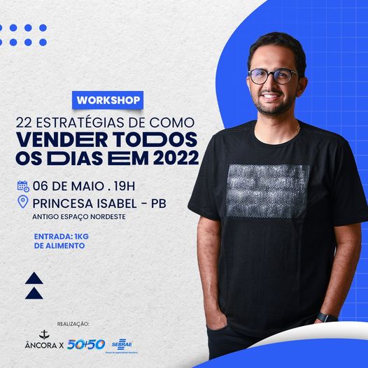 Nessa sexta-feira (6), será realizado em Princesa Isabel, o Workshop 22 Estratégias de como Vender Todos os dias em 2022, no Antigo Espaço Nordeste, às 19h. O evento acontece de forma gratuita e é voltado para empresários, novos empreendedores e profissionais que desejam aumentar as vendas dos seus produtos ou serviços.