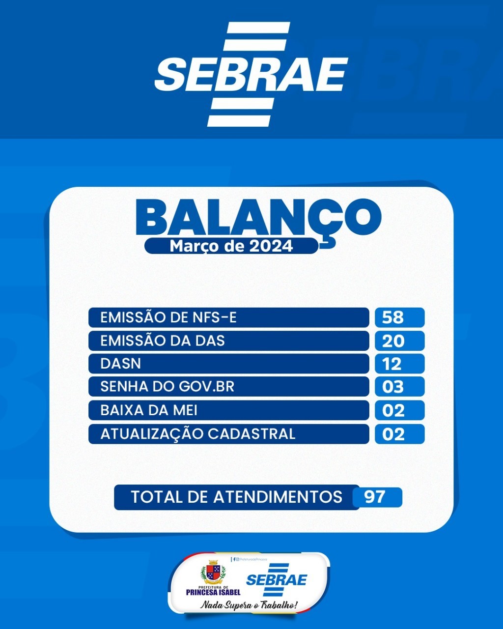 O Posto de Atendimento do Sebrae, ou Sala do Empreendedor, aqui de Princesa, realizou 97 atendimentos no mês de março. Desses, foram 20 emissões da DAS, 58 emissões de NFS-e, 12 DASN, 02 baixas de MEI, 03 senhas do GOV, 02 baixas de MEI e 02 atualizações.