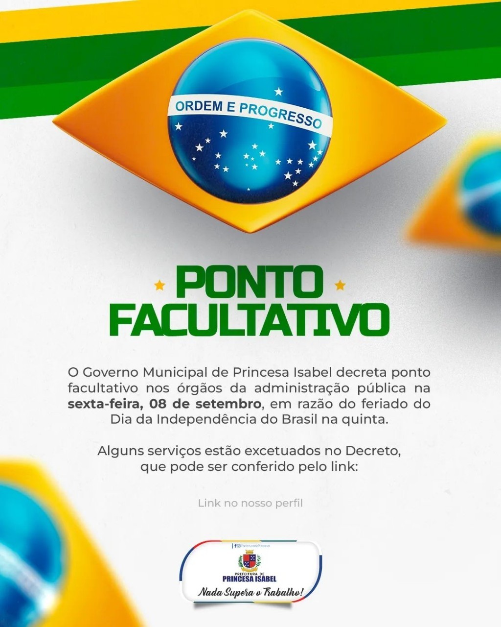 O Governo Municipal de Princesa Isabel decreta ponto facultativo nos órgãos da administração pública na sexta-feira, 08 de setembro, em razão do feriado do Dia da Independência do Brasil na quinta.