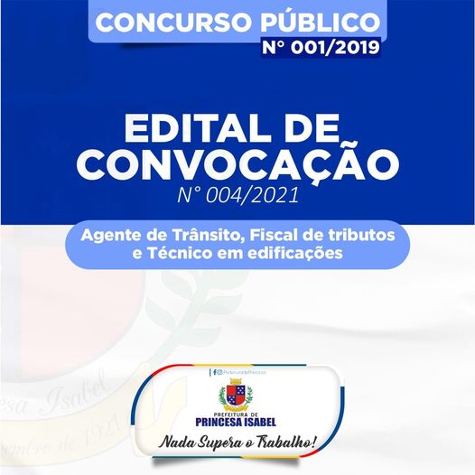 A Prefeitura de Princesa Isabel convoca candidatos classificados no último Concurso Público realizado pela instituição para avaliação da aptidão física e mental. Os mesmo devem se apresentar munidos de exames médicos e complementares, a fim de serem averiguadas as condições de saúde dos próprios, de acordo com as exigências das atividades inerentes ao cargo. Após avaliação dos exames, o candidato será declarado apto ou inapto para o exercício do cargo.