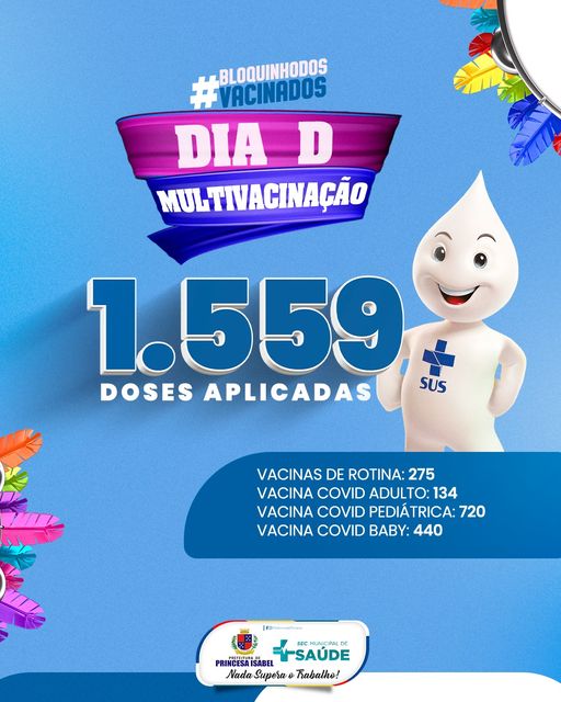 O município de Princesa Isabel aplicou, em dois dias D de vacinação, o total de 1559 doses de imunizantes na população. Nos últimos dias 03 e 04 a campanha foi intensificada com o objetivo de atingir um maior número de pessoas.