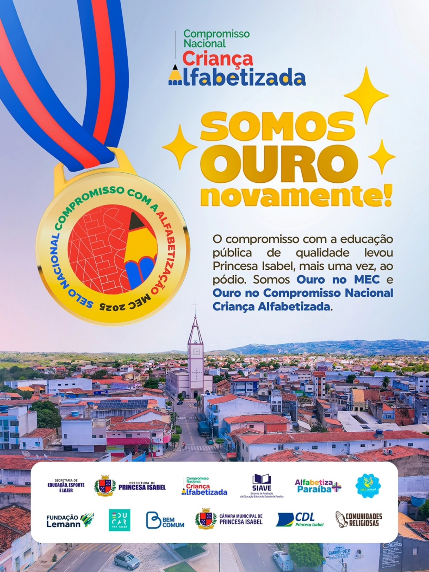 Princesa Isabel conquista, pela segunda vez, o Selo Ouro, o mais alto reconhecimento nacional concedido aos entes federados que alcançam resultados efetivos na alfabetização das crianças. A certificação é concedida pelo Ministério da Educação aos municípios que demonstram excelência na implementação de políticas públicas voltadas à alfabetização na idade adequada.