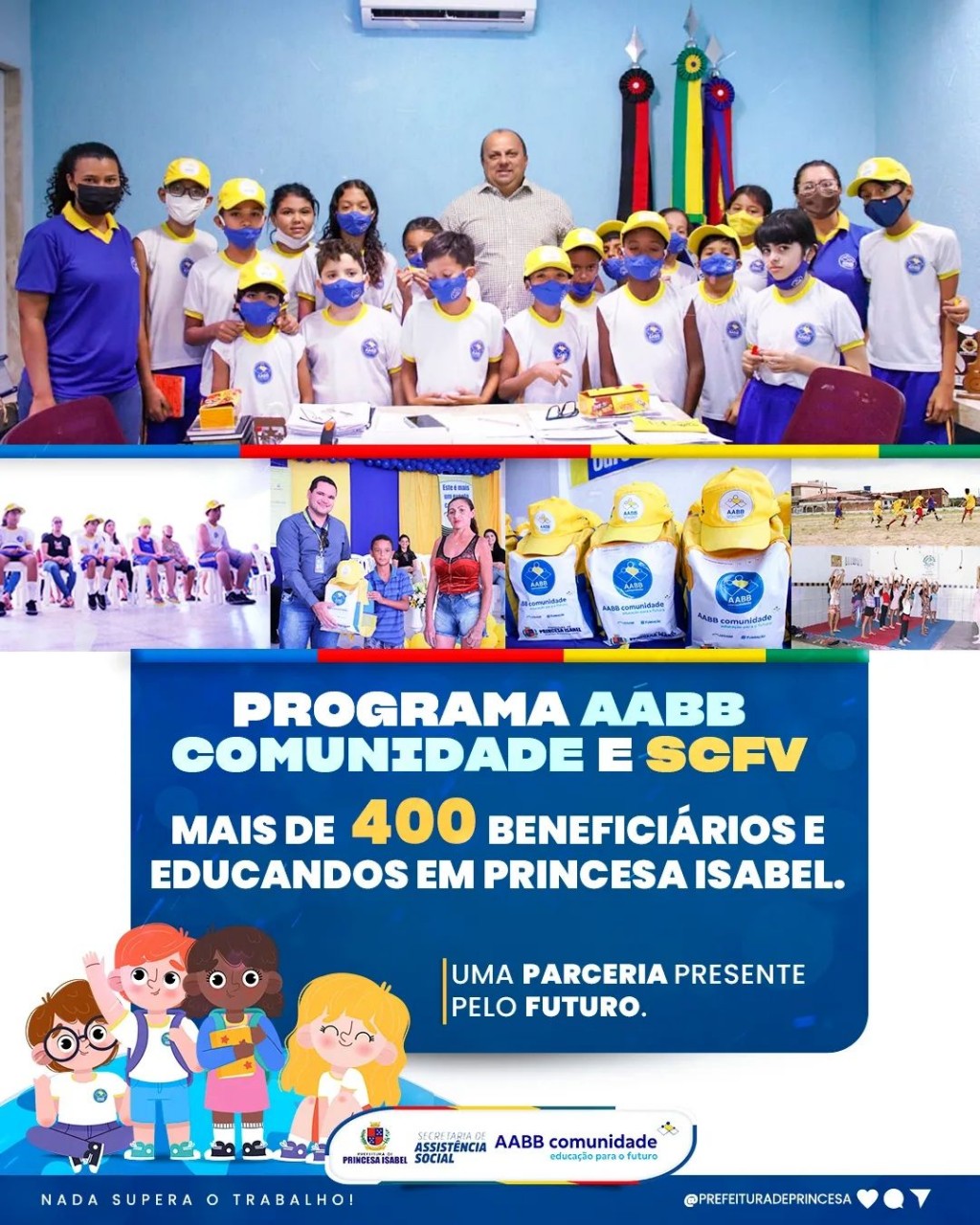 O Serviço de Convivência e Fortalecimento de Vínculos e o Programa AABB Comunidade atendem juntos mais de 400 crianças. São oferecidas oficinas, atividades esportivas e educacionais. A parceria com o Governo de Princesa Isabel garante a construção de um futuro melhor para nossas crianças e adolescentes.