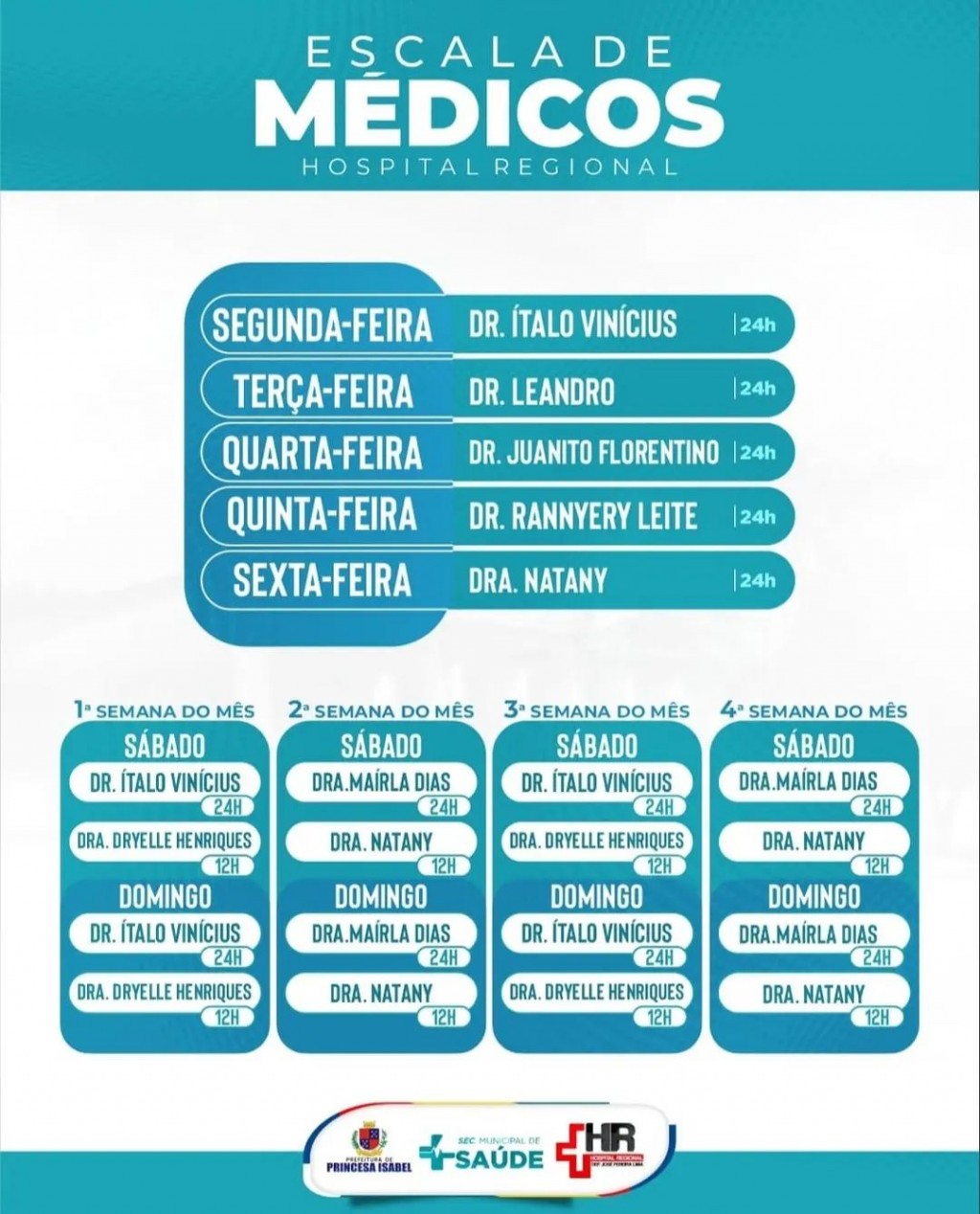 O Hospital Regional Deputado José Pereira Lima funciona 24h por dia, 7 dias por semana, atendendo pacientes de média complexidade, de Princesa e outros 17 municípios do sertão e alto sertão da Paraíba e do Pernambuco. Confira a escala médica da unidade!