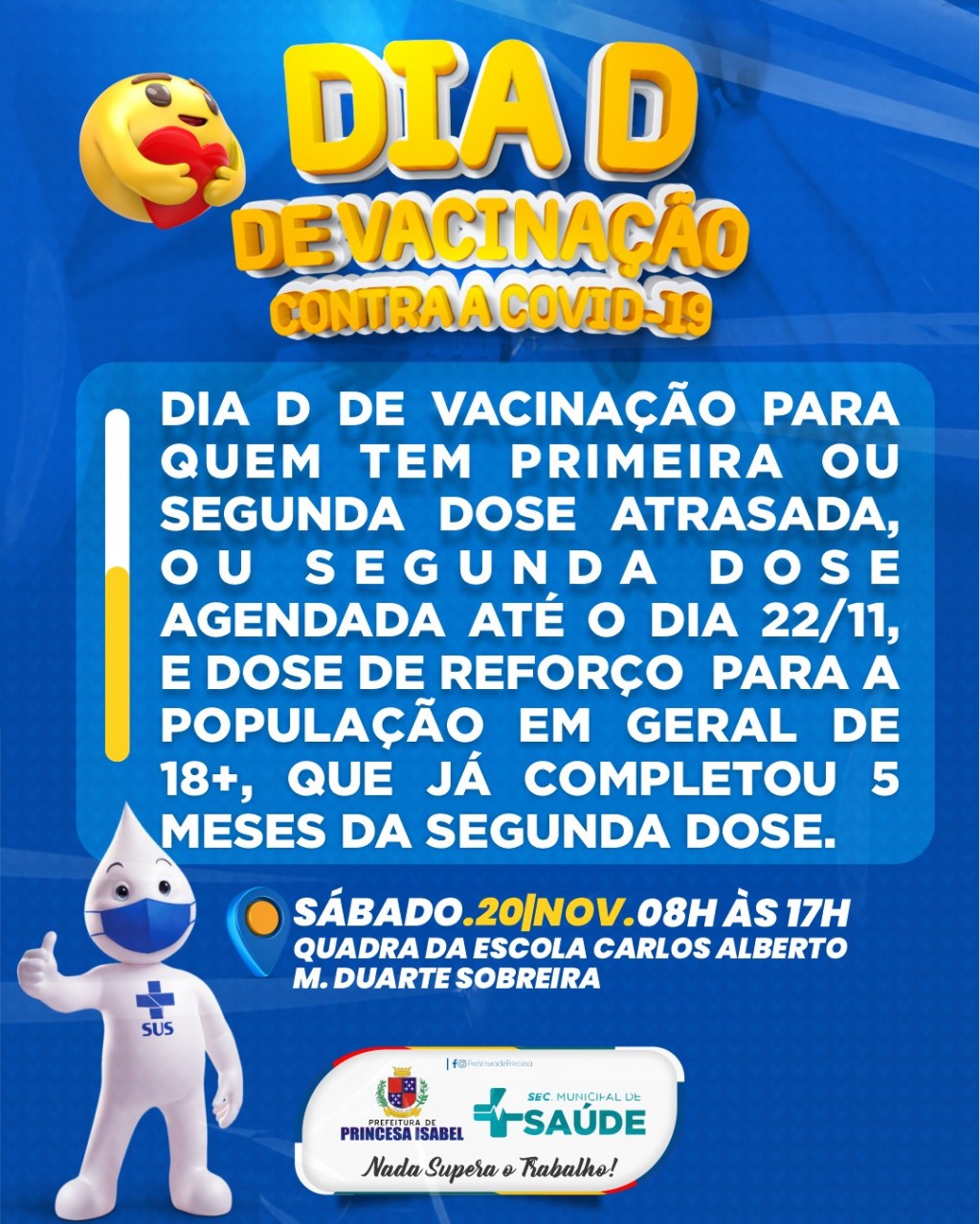 Se você tem primeira ou segunda dose atrasada, ou segunda dose agendada até 22 de novembro, dirija-se à quadra da escola Carlos Alberto neste sábado (20), com seus documentos pessoais e cartão do SUS, para se vacinar. E se você tem 18 anos ou mais e já passou 5 meses que você recebeu a segunda dose, você também deve participar do mutirão para receber a dose de reforço.