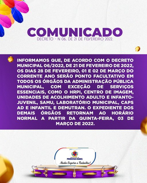 Ponto facultativo nos órgãos da administração pública municipal nos próximos dias.